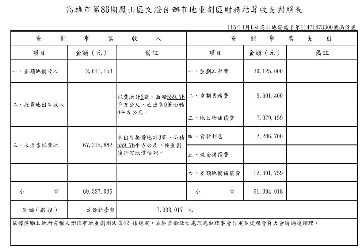 高雄市第86期鳳山區文城自辦市地重劃會114年5月26日文澄自重字第114018號公告,公告期間自114年5月27日起至114年6月26日止。